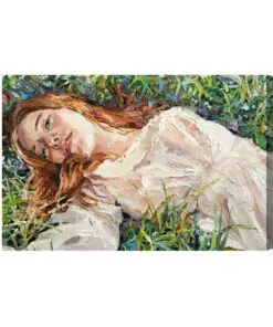 Leinwandbild A Young Girl Is Sitting In An Ethnic White Dress. The Background Depicts An Autumn Field With Flowers And Herbs. Oil Painting On Canvas.